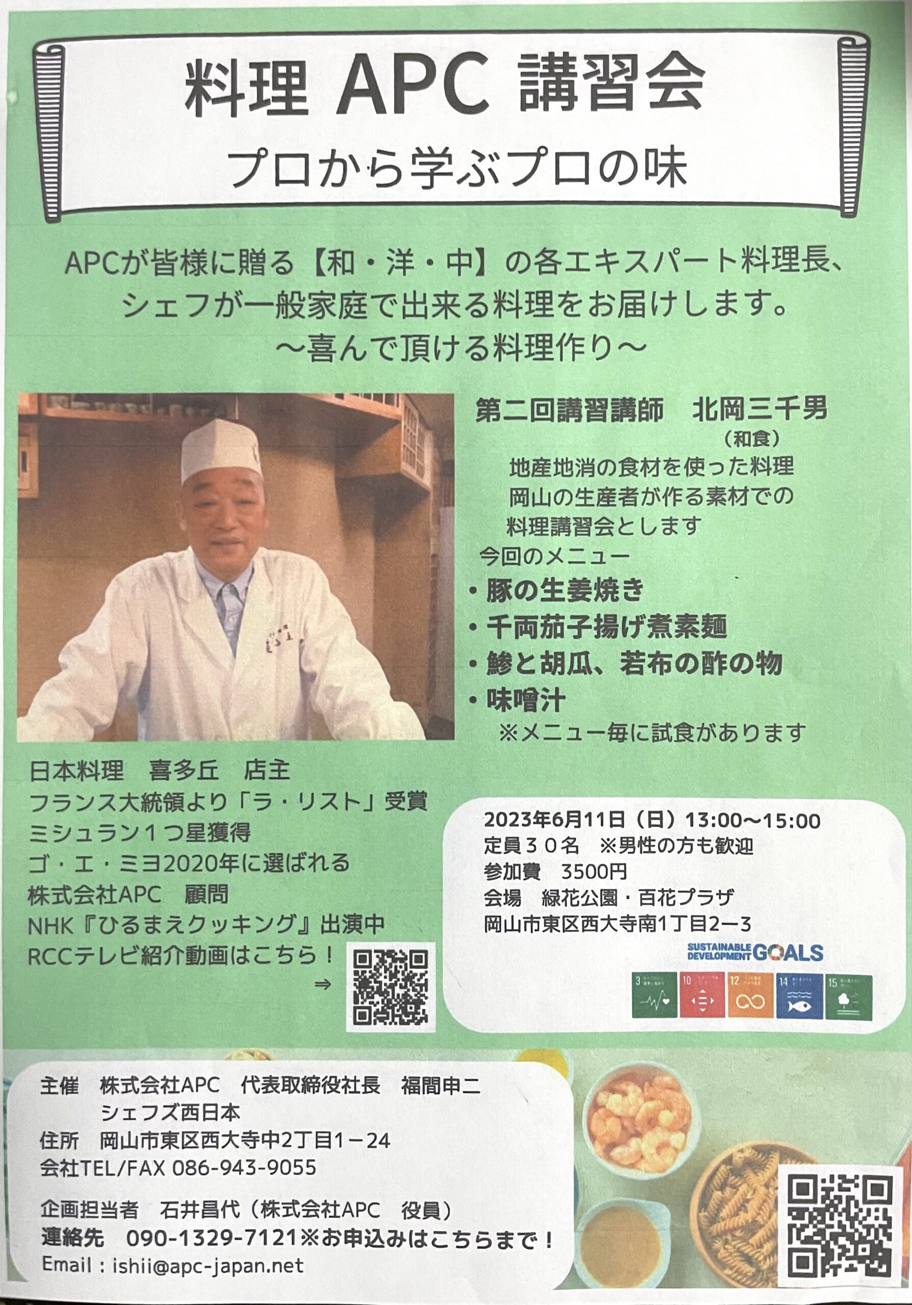 第三回「APC料理講習会」のご案内です!私は企画担当しています!「プロから学ぶプロの味」第三回目を担当してくださるシェフのご紹介です!講師  臼井 勉 創作料理※両備グループの料理部門統括※瀬戸内シェフズサミットを料理統括 責任者として指揮...