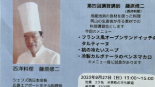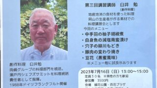 2023年6月11日(日) 13:00〜15:00講師/北岡三千男(和食料理)会場/緑花公園・百花プラザ(岡山市東区西大寺南1丁目2-3)参加費/3,500円定員/30名※男性の方も歓迎〈今回のメニュー〉 ※メニュー毎に試食があります・豚の...